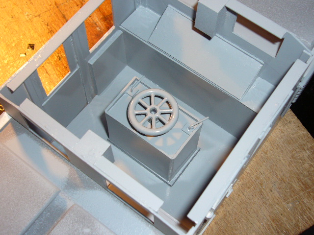 Um wieder in das Projekt rein zu kommen, habe ich mich mit der Inneneinrichtung des Führerstandes beschäftigt. Da auf Grund der kleinen Fenster nicht so viel von draussen zu sehen sein wird :versteck: beschränke ich mich auf die markanten Teile wie dem großen Fahrschalter, der in der Mitte des Führerstandes angeordnet ist. Die Abmaße wurden der Zeichnung entnommen, das Handrad (mit 8 statt 5 Speichen) der Bastelkiste.