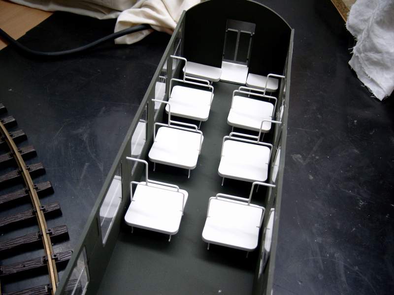 Habe bei dem fiesen Wetter mal wieder ein wenig Zeit für die Inneneinrichtung meines KB4i gehabt. Die tragenden Gestelle und die Sitzflächen habe ich fertig und für die Fotos mal locker in den Wagenkasten gestellt. Das Material ist Polystyrol, CNC gefräst.