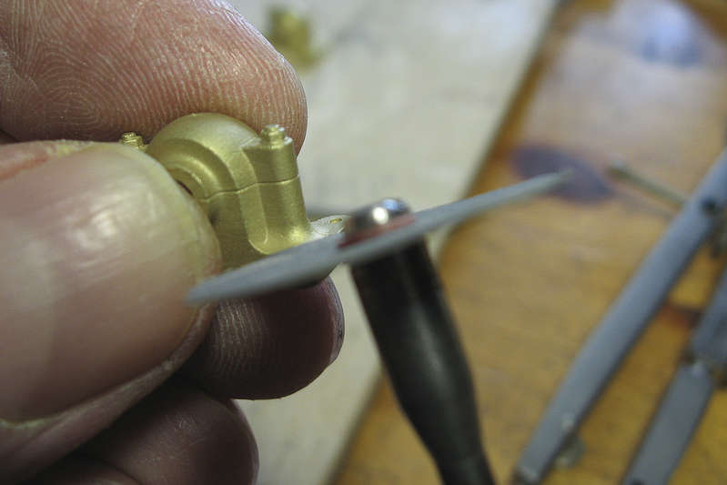 Auch hierzu mussten die Gussteile aufwändig bearbeitet werden. Die geschlossene Seite der Bügelpendellagerböcke war für den Guss etwas zu dünn geraten, weswegen der Gießer dort etwas Material aufgespachtelt hat. Das musste wieder plan heruntergenommen werden, was Frithjof dankenswerterweise auf der Fräse gemacht hat. Ich habe dann die an die U-Profile anliegenden Außenflächen auf Sollmaß geschliffen und im Hohlraum der Lagerböcke mit einem kleinen Fräser Messingperlen entfernt, die durch eingeschlossene Luftblasen in der Einbettmasse entstanden sind. Dann müssen noch die viereckigen Löcher ausgefeilt und die Bohrung aufgerieben werden, damit die Bügelpendelbolzen passen.