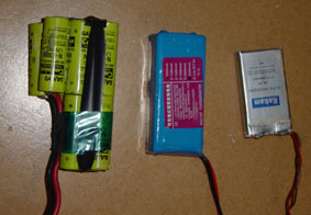 Links die 10 NICD/NImhy Zellen heute mit bis zu 2400mAh, in der Mitte die LIPO´s mit 2300mAh, 11,7V und links die erwähnten 1100mAh, mit denen ich mit Faulhaber Antrieben mit Getriebe sogar 10 Stunden ununterbrochen fahre!