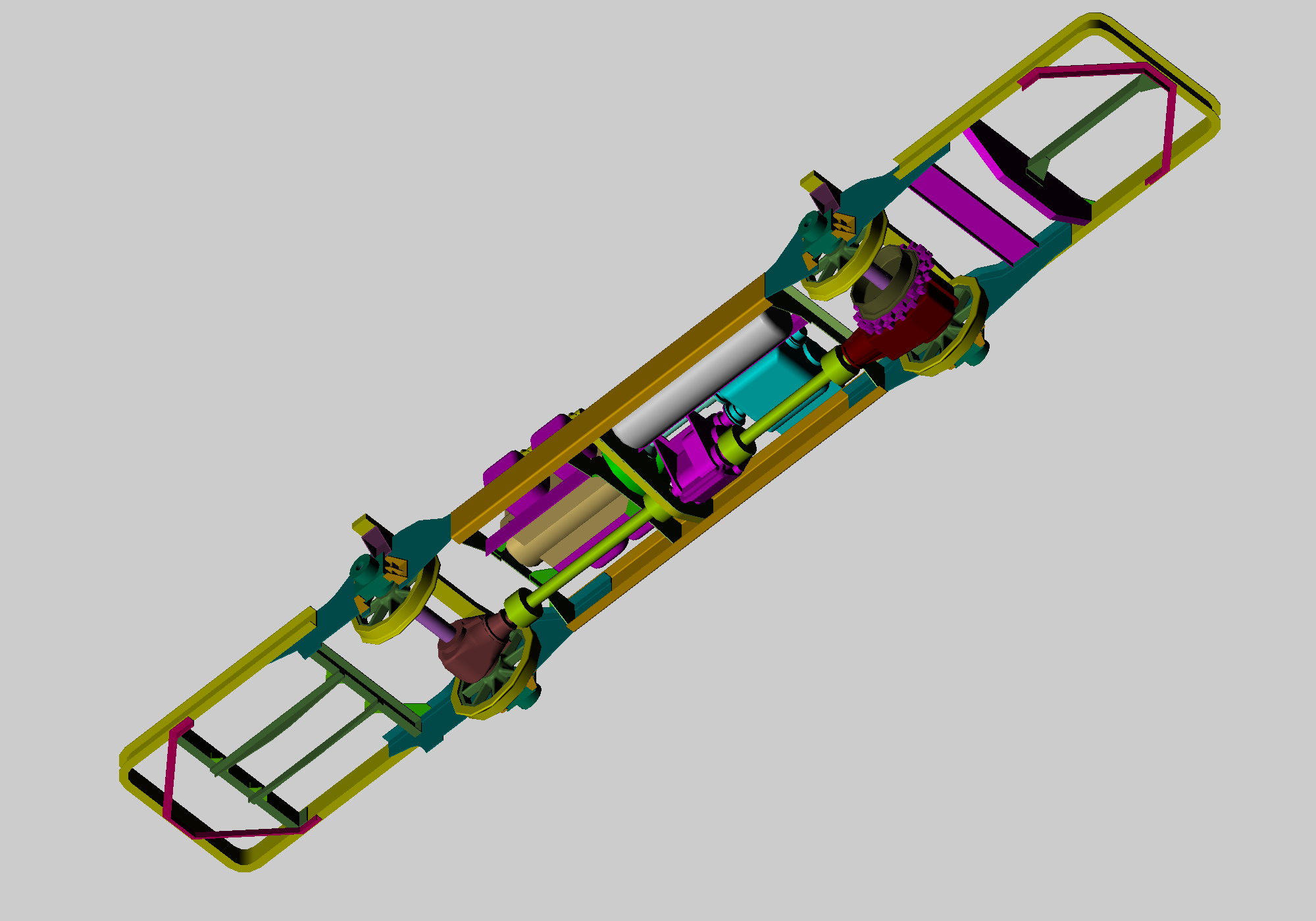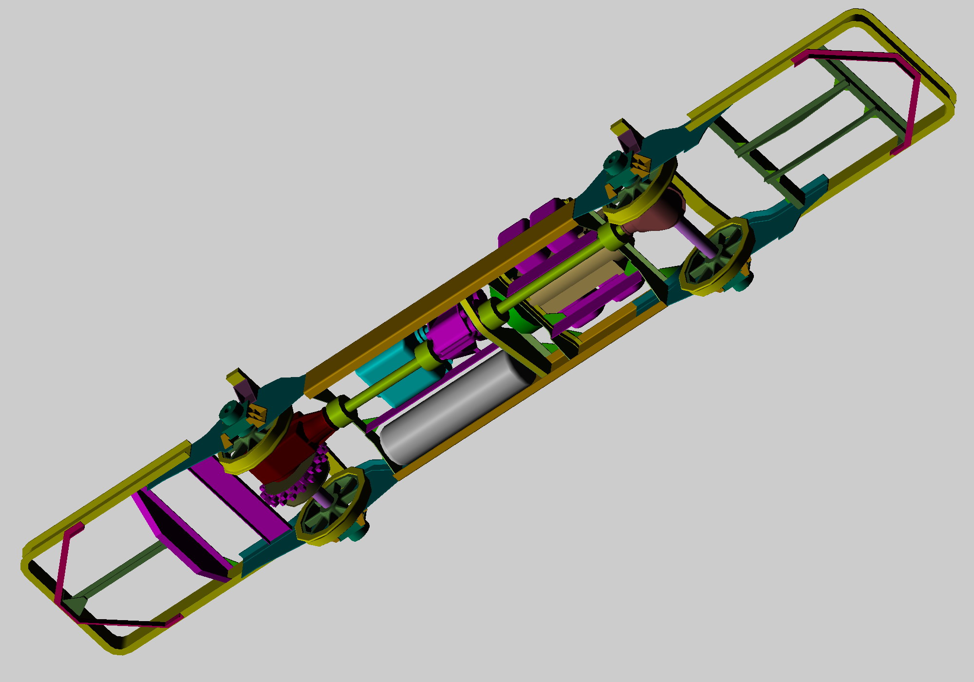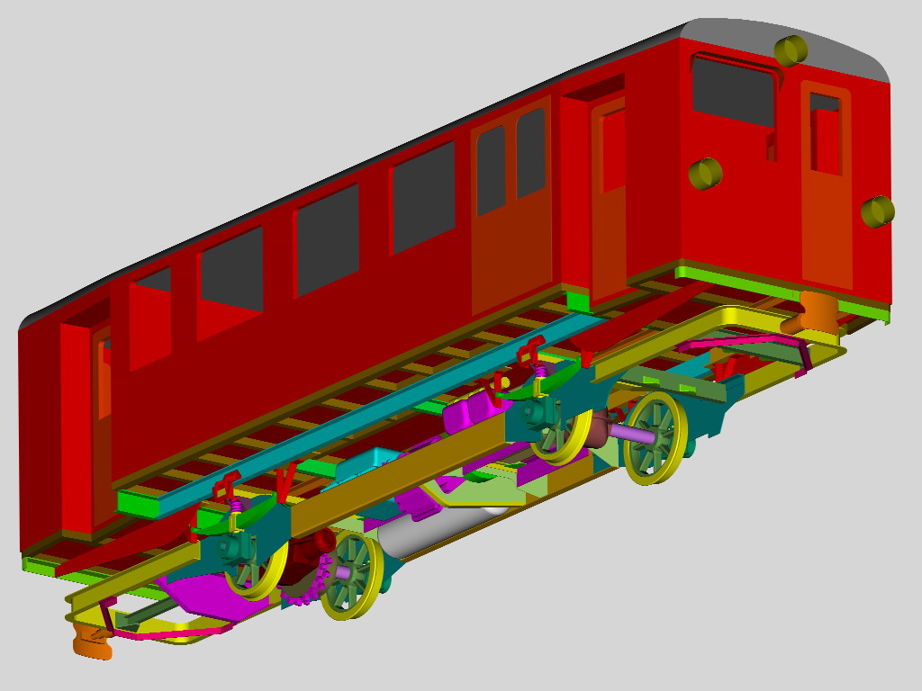 Aufgrund dieser 3D Modellierung aus dem 2D Daten hab ich viel gelernt, wie der untere Rahmen mit dem oberen Rahmen (Aufbau) verbunden ist und natürlich wie der komplette Antrieb funktionierte. (8 Zylinder Motor, Schaltgetriebe, Wendegetriebe, eine Achse mit Zahnradantrieb andere nur Adhäsion)