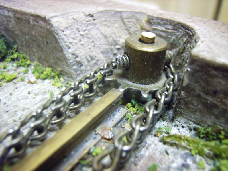 Auf der anderen Seite wird diese Kette mit einem runden Holzklotz umgelenkt (sorry für das unscharfe Foto).