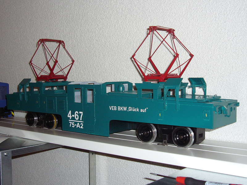 wurde auch gleich beschriftet. Und eine Stellprobe mit den nackten Drehgestellen und rotlackierten LGB-/Sommerfeldt-Hauptstromabnehmern (das sind nicht die H0-DBS 54, die kommen auf die schrägen Seitenstromabnehmer-Halter) durchgeführt: