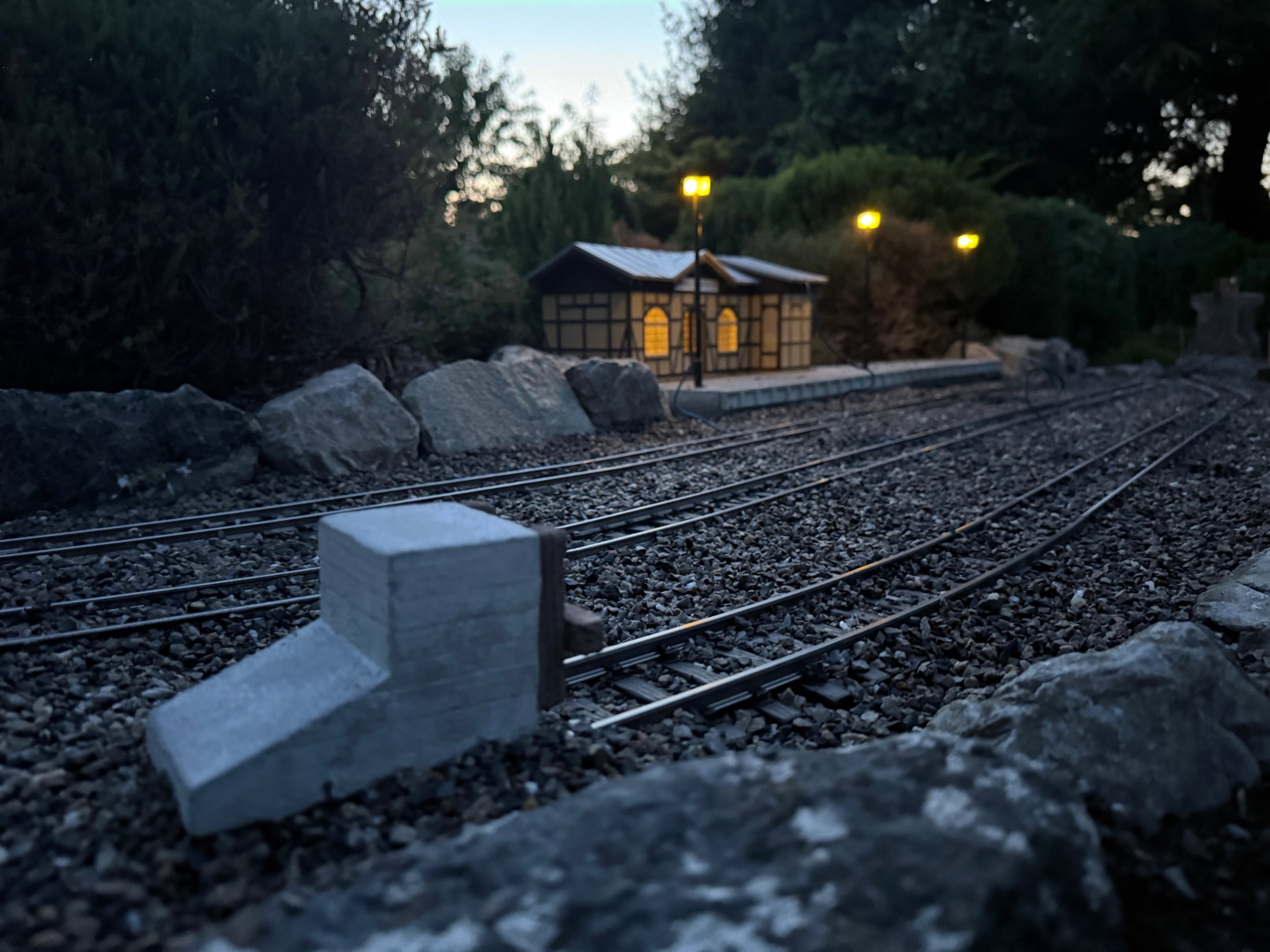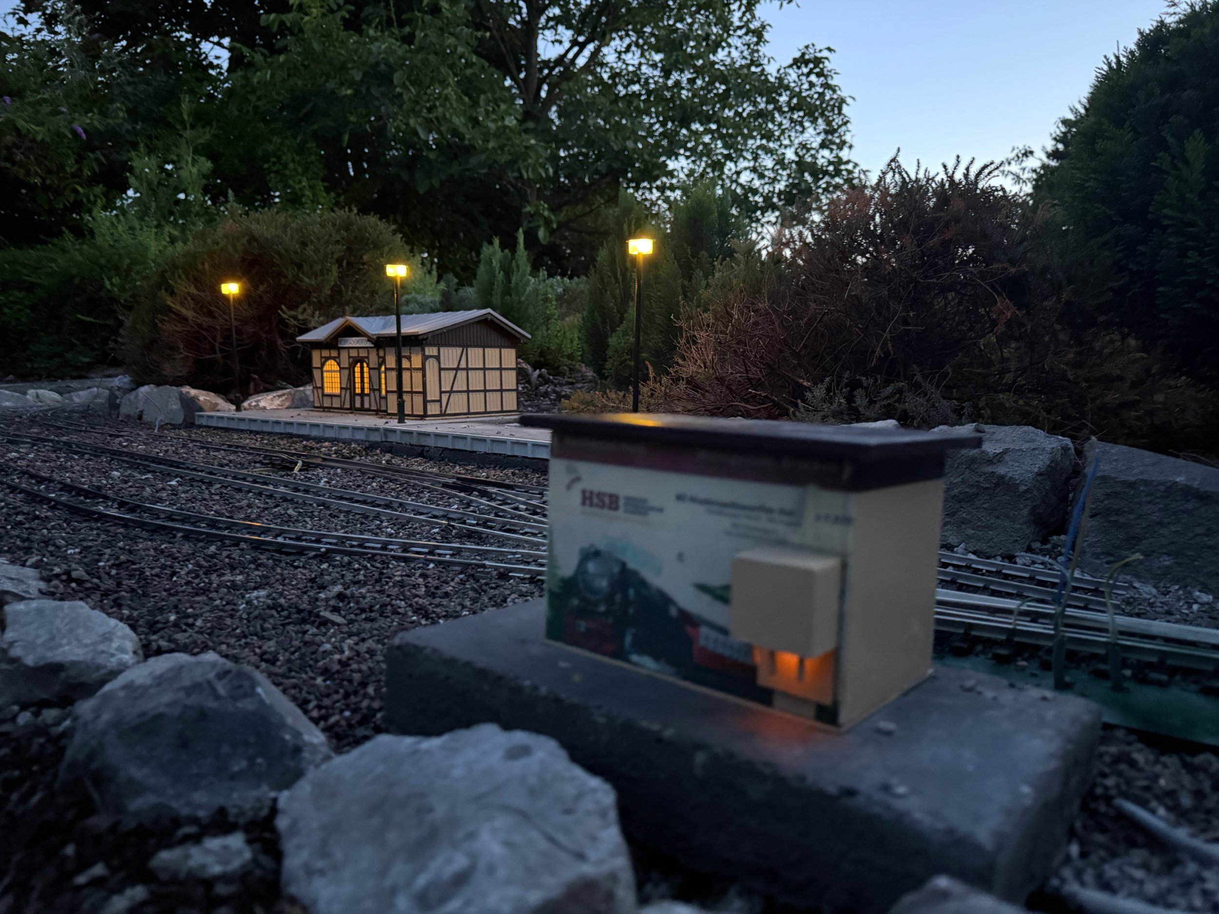 Der neue Bahnhof Niedersachswerfen steht im Vorbild auf der Seite Nordhausen. Die Beleuchtung der Modells - ein Bausatz aus dem Hause Heyn - orientiert stark an den typischen alten DDR Lampen. Daher möchte ich mit Nachtfotos vom allerersten Test der Beleuchtung beginnen: