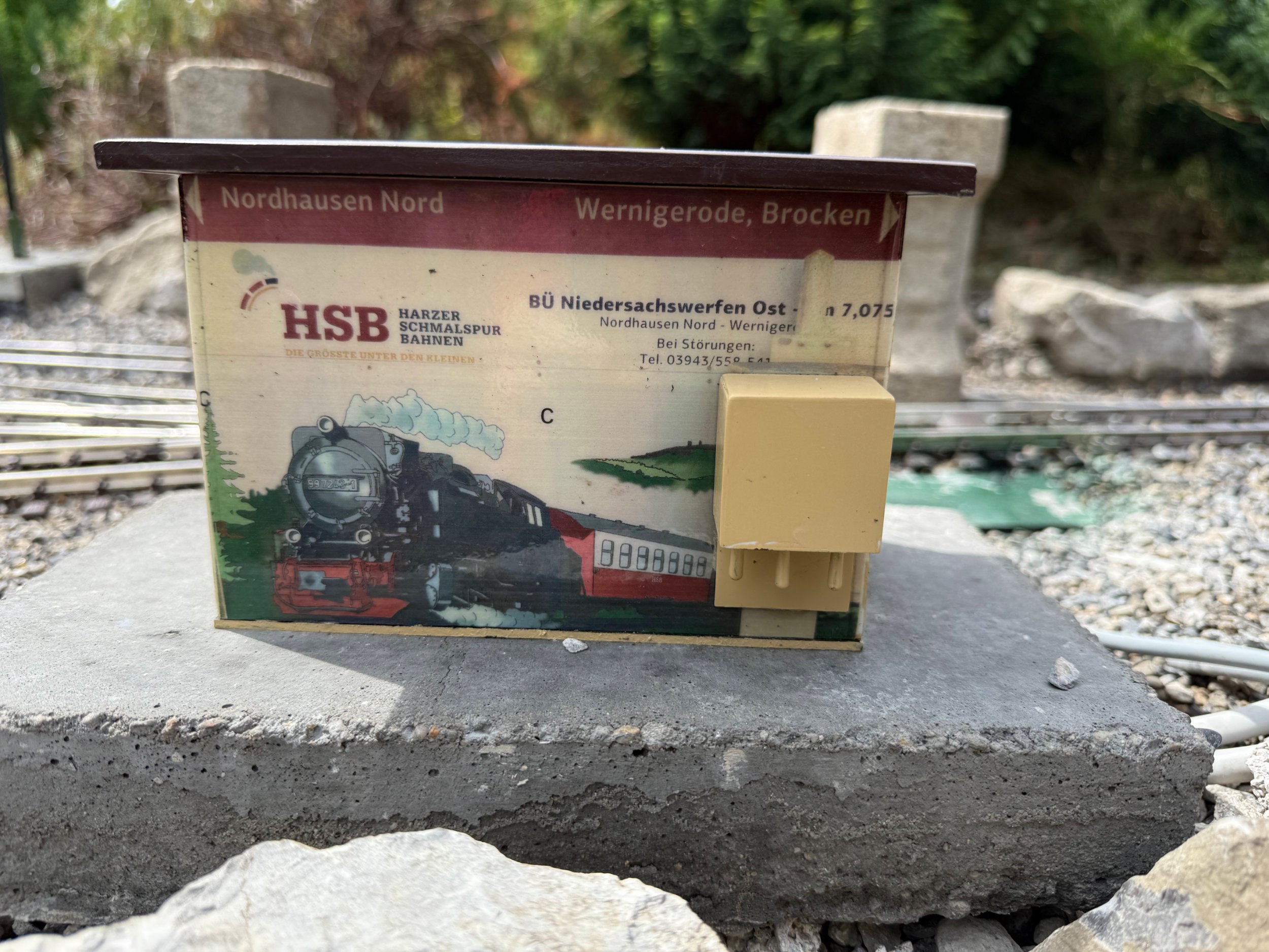 Anfangen möchte ich mit dem Bahnübergangshäuschen, das die komplette Steuerung und Technik enthält. Von vorne sind die Weichenschalter zu sehen - das grosse "F" fehlt noch. Gebaut ist das Häuschen aus dickwandigen ABS und Aluminium für die nötige Stabilität.