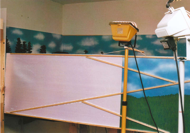 die, zusammengefügt, an einem ´Galgen´, der gleichzeitig für kräftiges Licht sorgt, aufgehängt den Hintergrund für "Gegenschüsse" geben:
