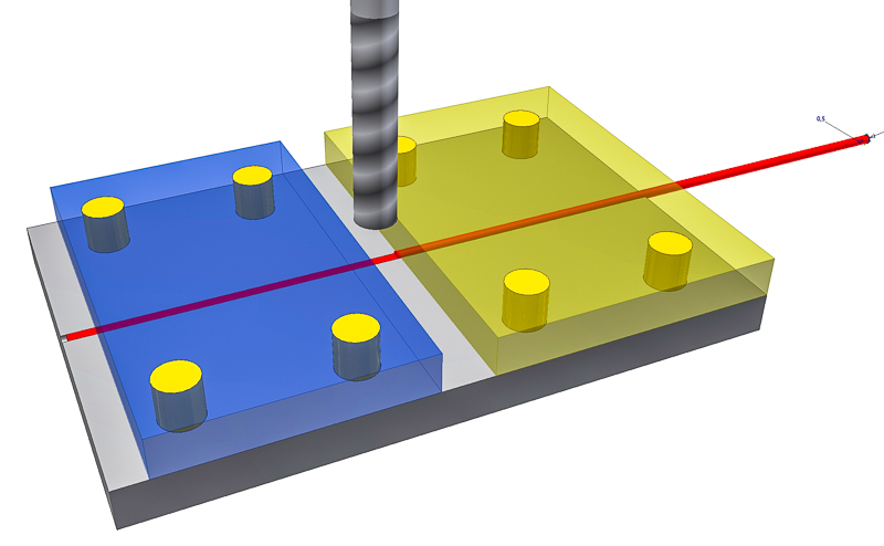 Die graue Grundplatte und die gelbe Deckplatte erhalten mittig eine 0,25mm tiefe Nut gefräst mit einem 0,5mm Fräser. Einen entsprechenden Kugelfräser muss ich bestellen.
