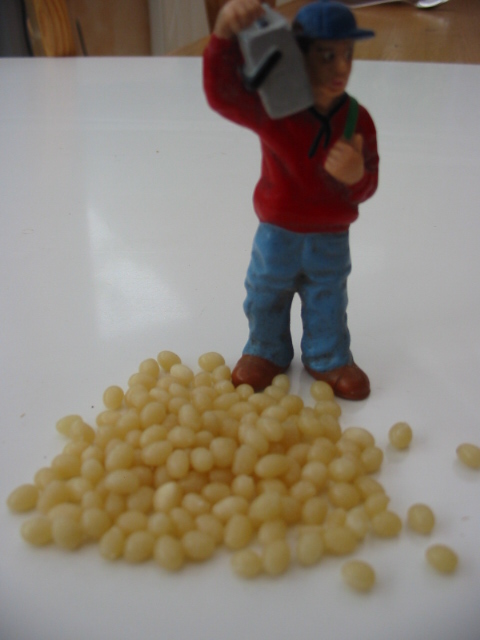 Habe eben bei der Arbeit Zuckerrüben oder Kartoffeln gefunden.das sind Schmelzkleberkörner die werden gebraucht um Kantenmaterial mit der Maschine aufzukleben.Fragt mal in der Schreinerei eures Vertrauens die gibt es da Säckeweise.Mit ein bischen Farbe sehen die aus wie frisch geerntet.