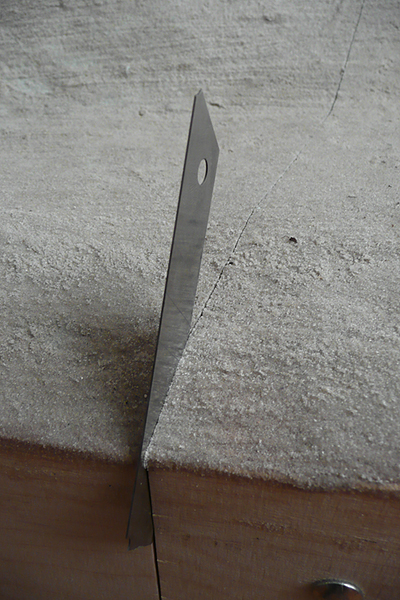 b. Zuvor hatte ich die MDF-Platten (wie auch bei meinen früheren Abgüssen, bei denen ich bislang nie Probleme hatte) mit einem Teflonspray eingesprüht. Nur hatte dieser Spray in den gefrästen Kanten der Nuten (1mm tief, 0,8mm breit) anstatt die Poren zu schließen hier das Gegenteil bewirkt. Sie müssen sich wohl geöffnet haben! Jedenfalls klebte das Silikon richtig fest und ließ sich somit nicht heil entformen. Zudem ist diese schmale und doch relativ tiefe Nut mit den senkrechten Fräskanten vielleicht etwas zu viel des Guten gewesen. Ich wollte in den Silikonformen die Mauer aus eingefärbtem Artestone gießen http://www.aura-shop.de/artestone.htm und anschließend die Fugen mit Gips verputzen. Diesen dann zum Teil wieder herausbröckel lasssen....