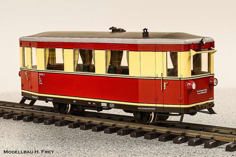 Das Modell entsteht in der bewährten Mischbauweise, das Gehäuse ist aus hochwertigen Vacuum-Kunstharzteilen gefertigt, filigrane Anbauteile wie Scheibenwischer, Griffstangen und Trittbretter hingegen sind aus Messing-Feinguß hergestellt um den Anforderungen eines Gartenbahnmodells gerecht zu werden. Beide Achsen werden durch Schneckengetriebe mit je einem 6 W Glockenankermotor angetrieben. Die Radsätze aus Edelstahl laufen in Messing-Gleitlagern, die Stromabnahme erfolgt durch alle Achsen. Die Bodenplatte besteht aus einer verwindungssteifen 8mm Aluminium Platte. Diese gibt dem kleinen Fahrzeug das nötige Gewicht (ca.1800g). Die Inneneinrichtung und die Farbgebung entsprechen dem Einsatzzustand der 1950er Jahre bis zur Außerdienststellung bei der DR und der heutigen Lackierung der HSB. Die Stirn- und Innenbeleuchtung erfolgt durch LED, das Modell wird für analogen Fahrbetrieb ausgeliefert, für Decoder oder Soundmoduleinbau ist eine entsprechende Anschlussmöglichkeit und bereits vorgesehene Einbauräume vorhanden. Das Modell kann wahlweise mit DR Beschriftung, als Gerätewagen der DR, GHE T1 oder in der heutigen HSB Variante ausgeliefert werden.