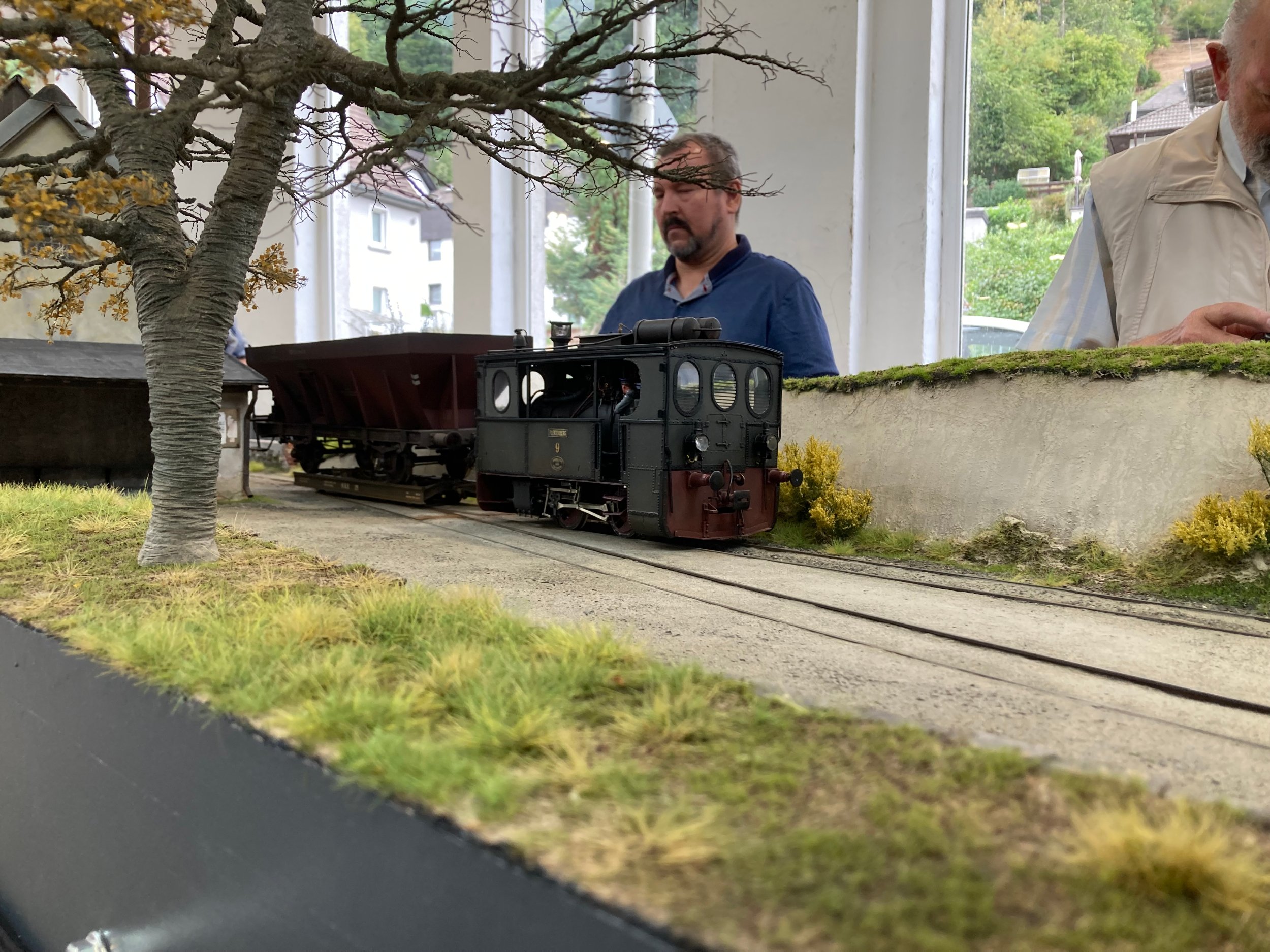 Das Modell der Hagans-Lok 5 OESTER von Wilfried Suttorp (digitalisiert von Gerd Hegny) an der Rollwagenanlage. Die Lok besaß zusätzlich zur Mittelpuffer-Balancierkupplung noch eine Trompetenkupplung für die Rollwagen – Foto: Frank Specht