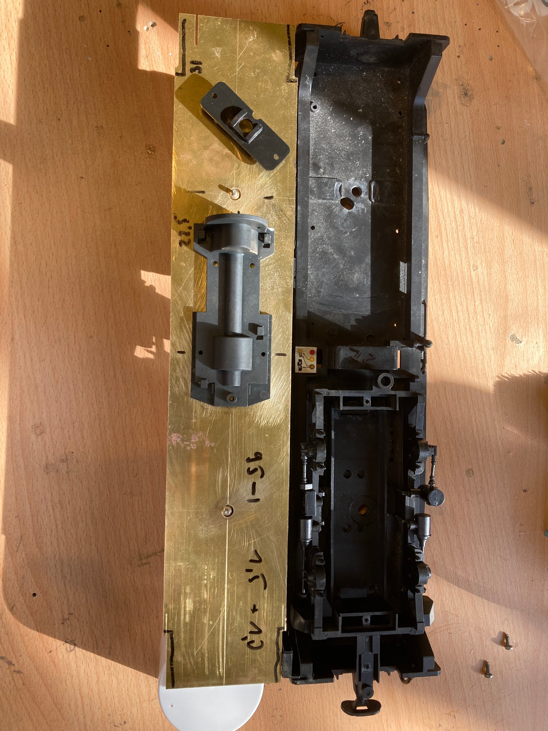 Da der Radstand im Drehstell bei der LGB Lok zu groß ist - 80 mm - das Vorbild hat 75, dafür ist der der Märklin Lok 3 mm zu klein. Aber der Gesamtradstand stimmt perfekt - Die LGB Lok ist wieder zu lang. So werde ich das Fahrwerk 1:1 übernehmen und nur neue Edelstahl-Radreifen und die gekürzten Drehgestellblenden von der LGB Lok verwenden.