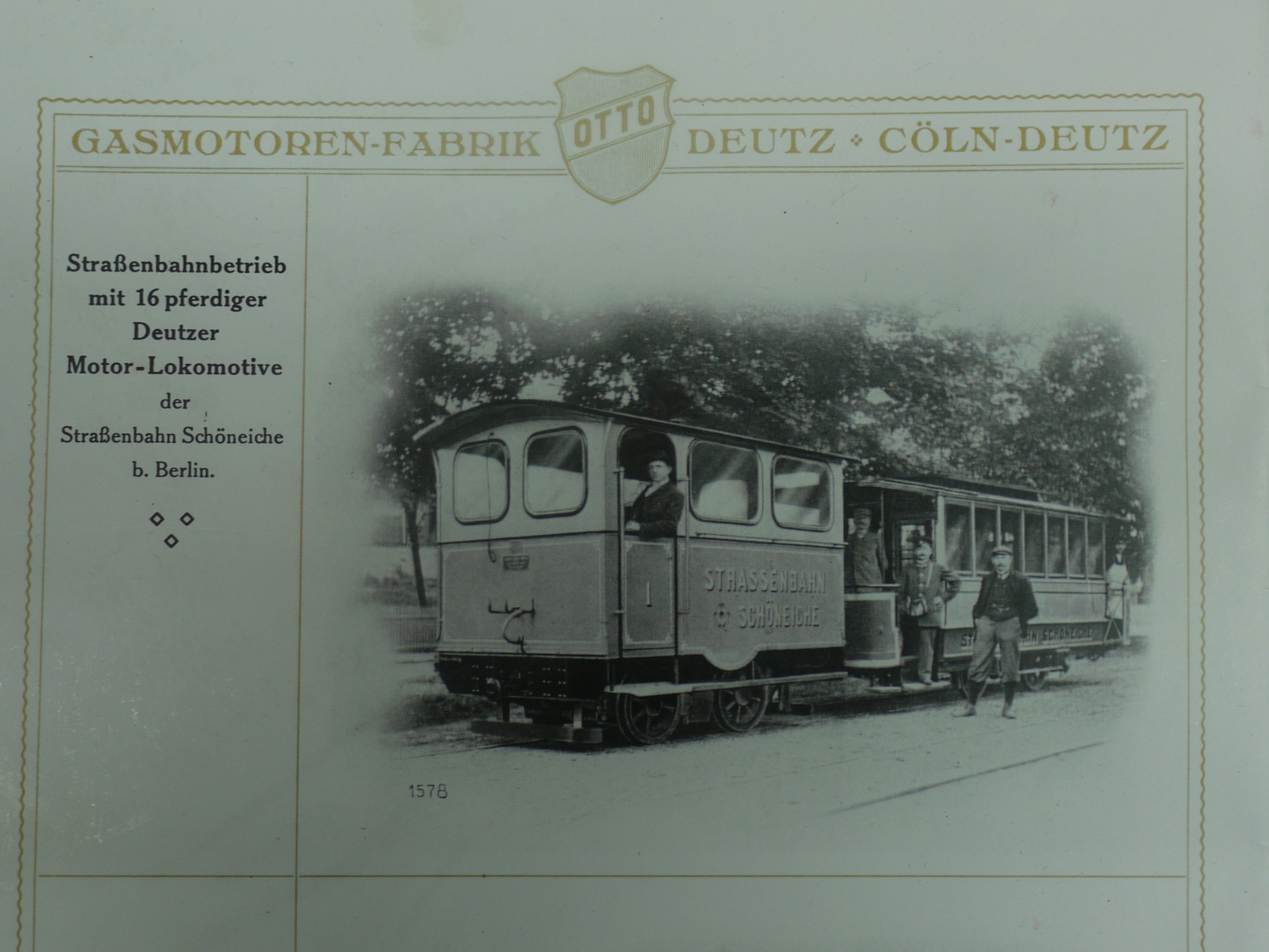 Die Lokomotive wurde 1910 gebaut und bei der Straßenbahn Schöneiche als erste Lok (Spitzname Benzoline) ab 28. August 1910 eingesetzt. Hierzu bzw. zu verwandten Lokomotiven konnte ich im Internet und in Printmedien eine begrenzte aber doch aussagekräftige Anzahl an Fakten und Bildmaterial finden, hier eine kurze Auswahl: