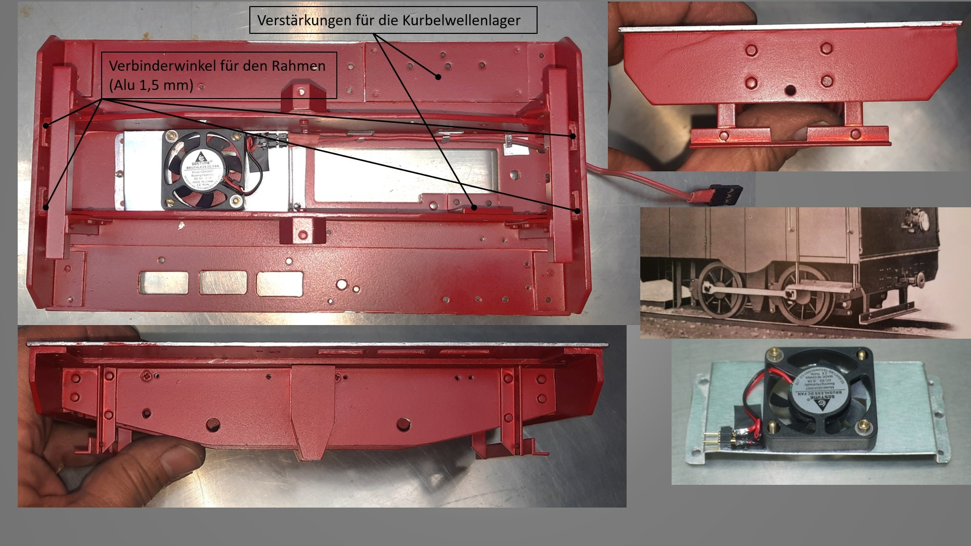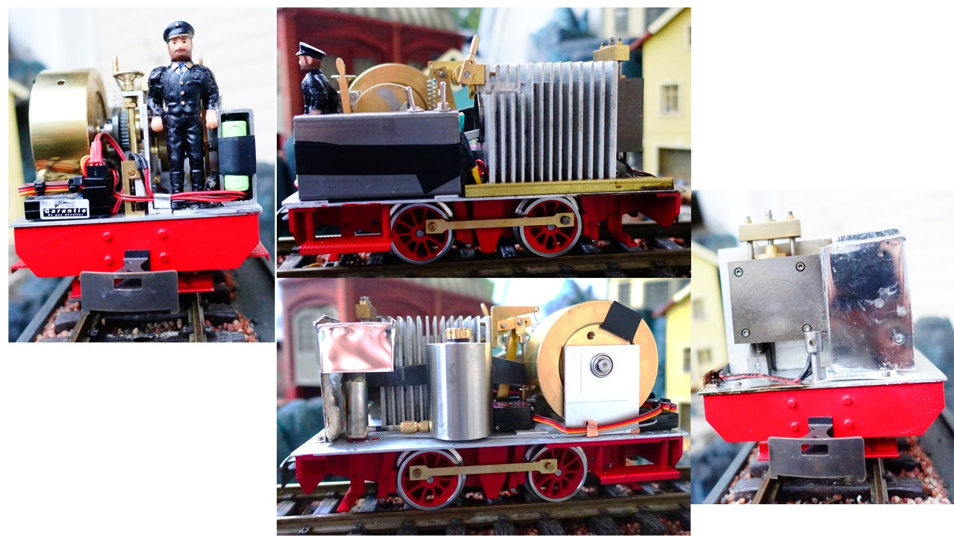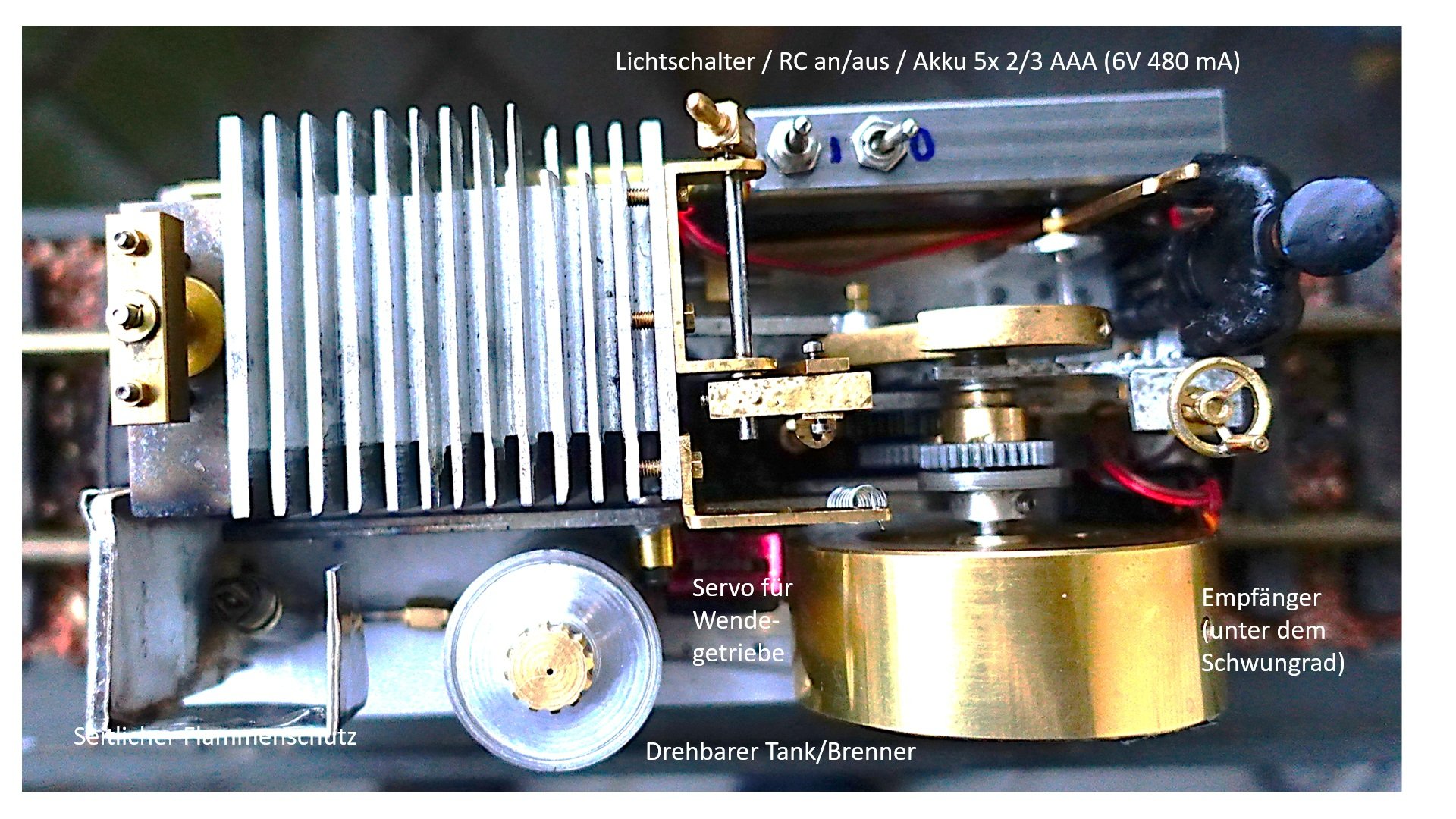 Die Lok wird mit einem luftgekühlten Flammenfresser-/Vakuummotor (ca. 26 cm³, ca. 700 U/min) angetrieben. Diese Antriebsart gilt ja trotz der einfachen Bauweise als nicht unproblematisch im Funktionsmodellbau. Die Motoren haben eine schönen Sound, gelten aber als recht zickig und leistungsschwach, was das ganze für mich aber auch irgendwie spannend machte.