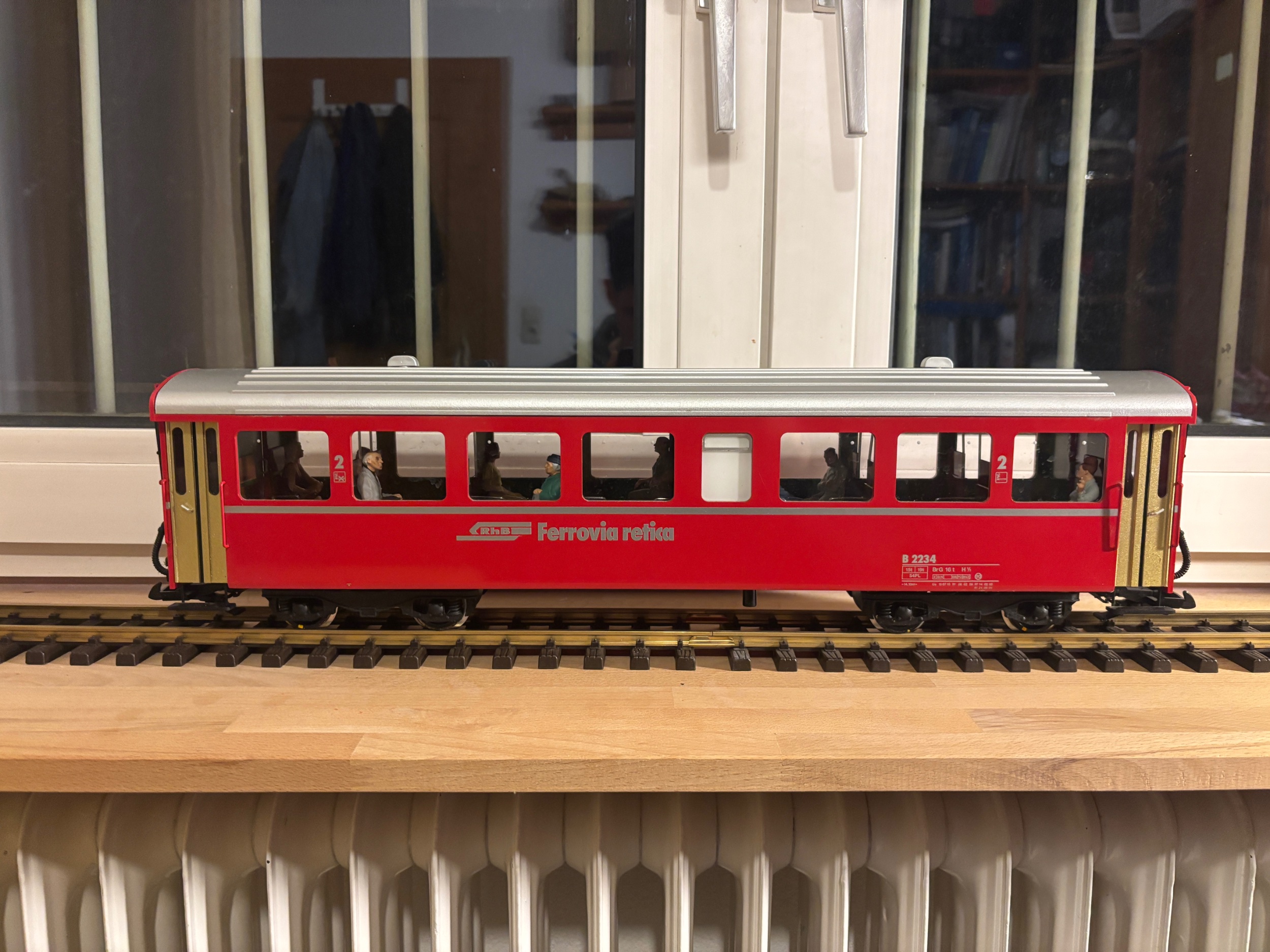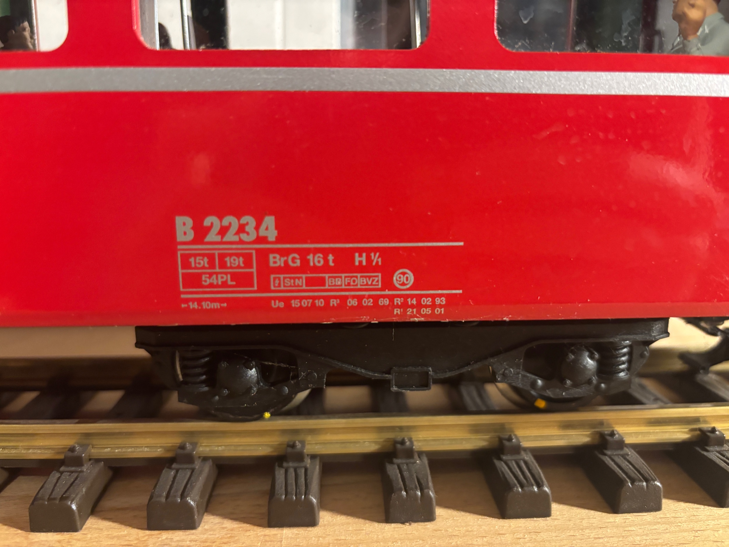 Ich habe vor einigen Monaten ein 2m Handarbeitsmodell des RhB B 2234 „Stutz“ privat erworben. Es handelt sich dabei offenbar um ein Modell eines auf Basis eines alten BB-Rahmens aufgebauten Reko-Wagen. Die Ausführung wirkt sehr professionell.