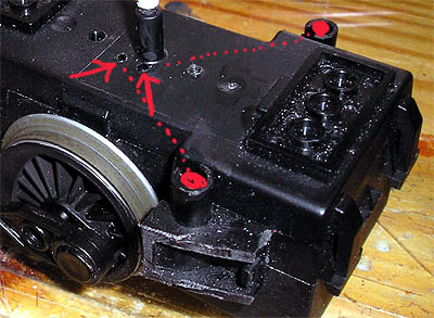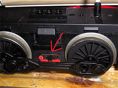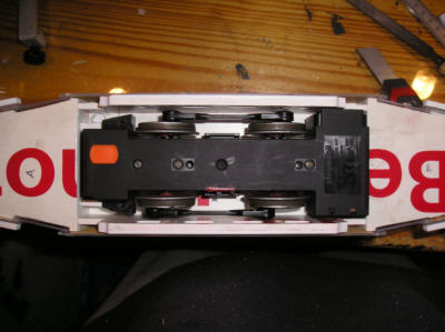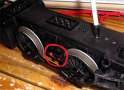 Der erste Umbau: Ich öffnete den Antriebsblock, der ziemlich vollgepackt ist, und suchte nach einer geeigneten Stelle, um die zwei Kabel (eines vom Akku und eines zur Elektronik) nach oben aus dem Gehäuse zu führen. Die Stelle neben dem Antennenröhrchen schien mir dafür gut geeignet. Ich zog beide Kabel durch die zusätzlich gebohrten Löcher und schloß sie links und rechts am Gehäuse an eine LGB- Hülse mit federnden Kohlestift an (der Antrieb muß abnehmbar sein, damit ich den Akku wechseln kann). Dort wurde das Ganze über ein Messingblättchen mit dem Wagenkasten verbunden, bei dem im Inneren die Kabel zum Dach führen, wo sich der Schalter befand. Die nun erfolgte Probefahrt zeigte die Schwächen meines Umbaus. Eine langsamer Fahrt war nicht mehr möglich, der Wagen stotterte nur oder gab in kurzen Abständen volle Leistung an den Motor, so daß der Wagen sich regelrecht aufschaukelte und auch teilweise entgleiste. Ich bin kein Fachmann auf dem Gebiet der Funkwellen und ich habe mir vorher auch keine Gedanken darüber gemacht. Ich vermute aber mal, daß durch das unmittelbare Nebeneinander von Stromübertragung und Antennenkabel es zu Störungnen beim Empfang kommt. Warum auch immer, so konnte es nicht bleiben! :cry: