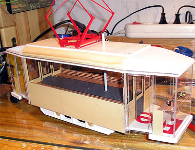 Zur Vorgeschichte: Für meine Kinder will ich ein relativ einfach gehaltenes Straßenbahnmodell bauen. Damit diese von mir unabhängig fahren können, benutze ich einen Antriebsblock der PM RC- Bahn. Ich besorgte mir eine Lok und die Fernbedienung und die ersten Proberunden verliefen ohne Probleme. Nach ein paar Tagen stellte ich fest, daß sich der Akku auch dann entlädt, wenn die Lok überhaupt nicht benutzt wird. Scheinbar ist die Elektronik ständig in Bereitschaft und wartet ununterbrochen auf ein Signal. Die Fernbedienung kann man ja abschalten, beim Antrieb ist dafür leider kein Schalter vorhanden. Deshalb wollte ich den Stromfluß zwischen Akku und Elekronik unterbrechen, der Schalter dafür sollte sich auf den Wagendach befinden. Nun begann der Umbau.