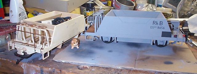 da ich am Wochenende an ein paar Gedanken zum Kroko gescheitert bin habe ich mal eben in gut 35 Stunden Arbeit zwei Schotterwagen für meine kleine RhB gebaut.