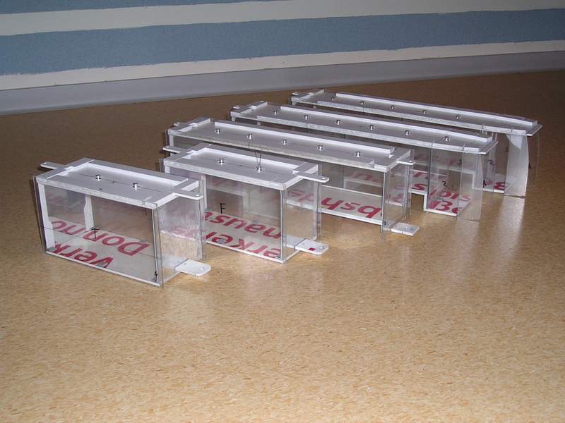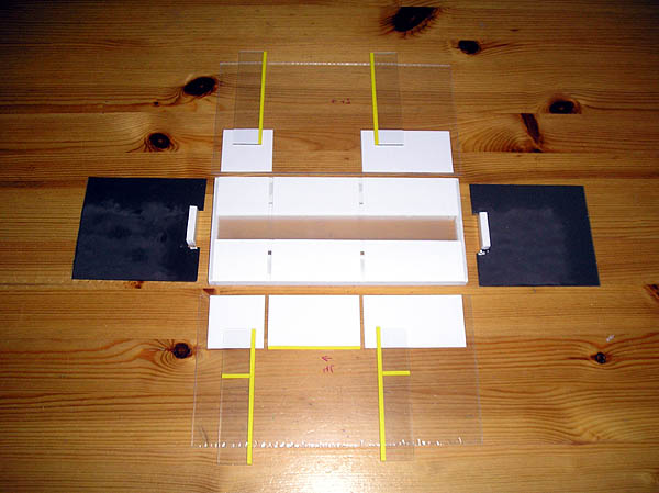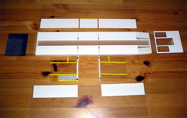 nun sind alle Teile für den Rohbau des Wagenkastens aus Bastlerglas zurechtgesägt. Bevor diese zusammengeklebt werden, habe ich schon die Innenwand- und Deckenverkleidung angebracht (Klebefolie). An den Zwischenwänden, die zur Stabilisierung der langen Wagenteile dienen, wurden die Haltestangen aufgeklebt, ebenfalls aus Klebefolie. Bei den kurzen Modulen sind diese Wände nicht durchgehend, sondern nur so breit, wie es die Nachbildung der Haltestangen erfordert.