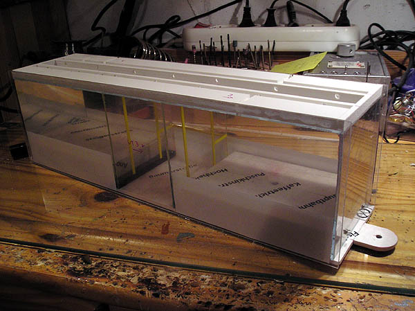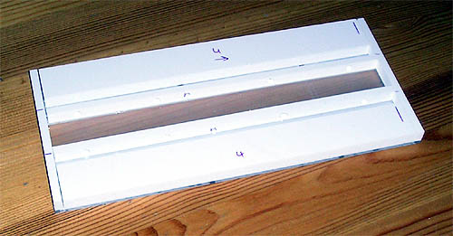 Die Oberseite der Dachplatte wurde mit PVC- Streifen so beklebt, das ein Lampenband in der Mitte frei bleibt und zu beiden Seiten ein Kabelkanal entsteht. Das Lampenband wurde vorher mit feinen Schleifpapier milchig geschliffen, damit man die Beleuchtungseinrichtung von unten nicht direkt sieht.
