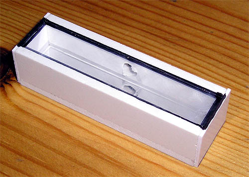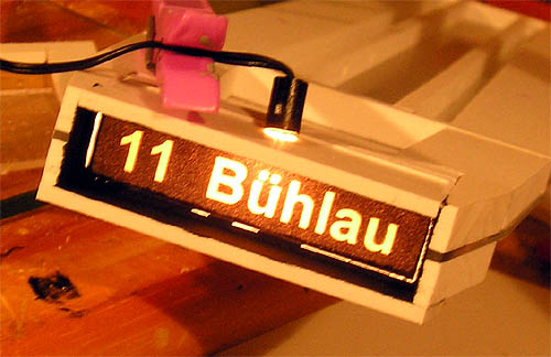 Unsere beiden Modelle fahren als Linie 11 nach Bühlau, was an der Front- und Heckanzeige angezeigt wird. Die folgenden Bilder zeigen den Bau der Anzeigen. Der eckige Kasten ist aus Polysterol, nur die Anzeigenfront ist aus Plexiglas. Die Wand gegenüber dem Plexiglas wurde von innen mit Spiegelfolie beklebt. An der Oberseite ist mittig ein Loch vorhanden, durch das später die Glühlampe gesteckt wird. Auf das Plexiglas wird das Fahrziel aufgeklebt (erstellt mit Computer und Etikettenpapier). Wahlweise kann man noch einen Streifen klare Folie/ Klebeband auf die Anzeige kleben, dadurch ist das Papier bei den weiteren Arbeiten besser geschützt.