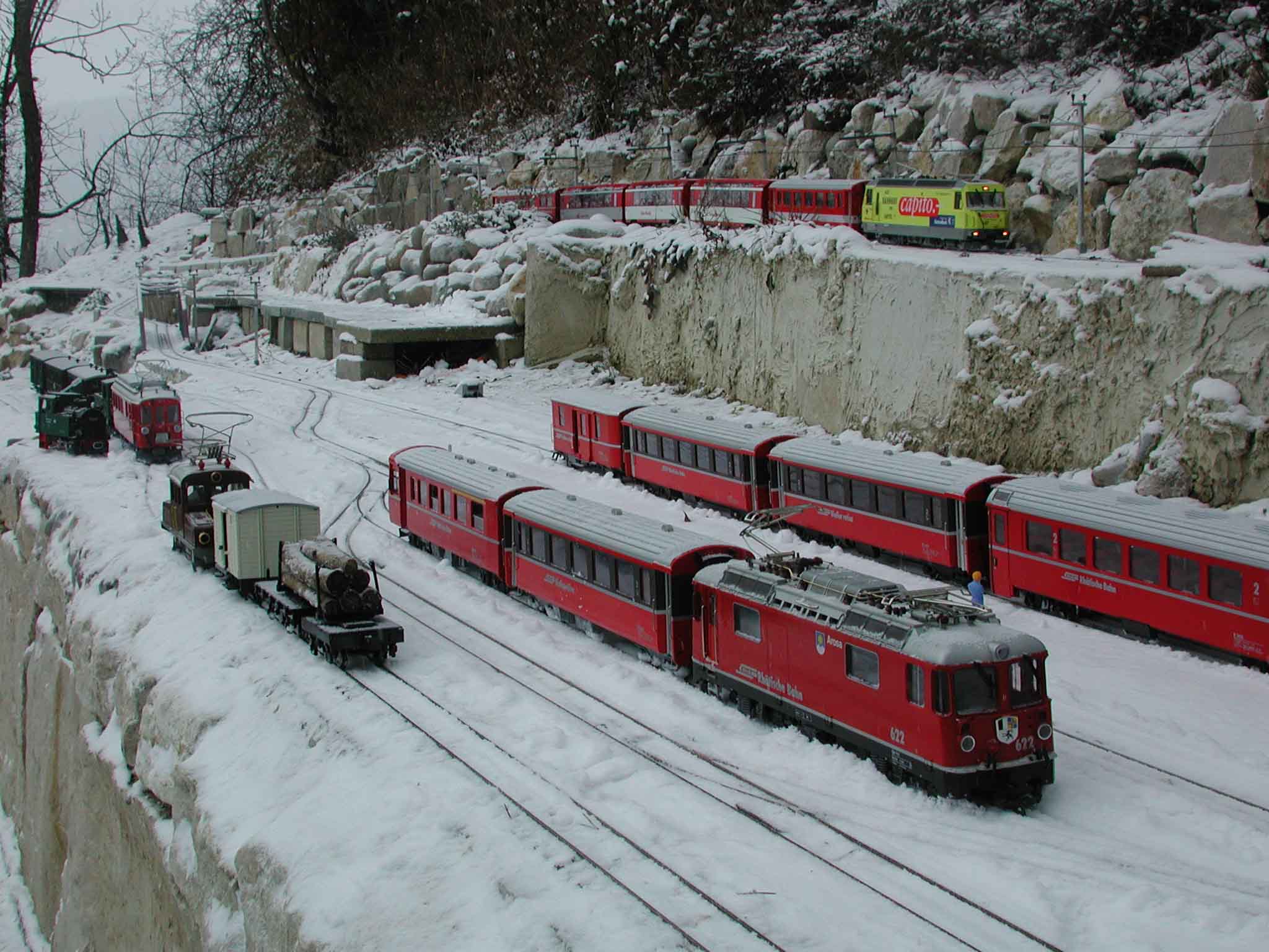 Noch ist es am Morgen früh. Der Extrazug mit der Heidi ist von "Tirano" her eingefahren (Linie rechts vom Schuppen). Das Eselchen 61 schaut noch aus dem Stall. Auf der Zahnradbahn (links vom Schuppen) ist auch noch nicht viel los.