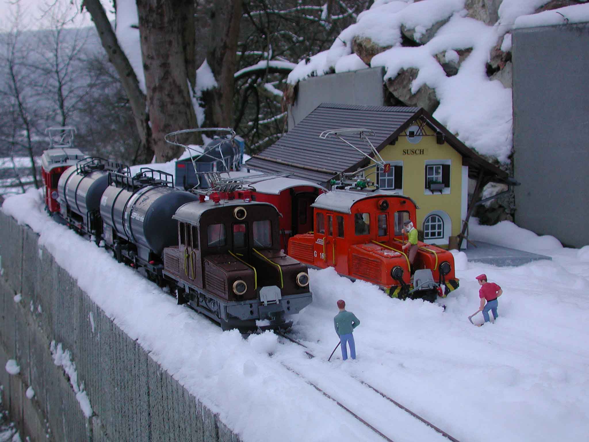 Aber jetzt ein Gruss d'Engiadina (aus dem Engadin), wo zur Zeit der Teufel los ist, weil tausende von Feriengästen hier oben die Weihnachtstage und den Jahreswechsel verbringen. Und die RhB hat viel zu tun. Natürlich wollen alle warm haben. Heizöl wird über den Bernina geschleppt und es gibt auch viel Gepäck zu transportieren. Auf dem kleinen Bahnhof Susch haben die Leute alle Hände voll zu tun. Zudem müssen die Weichen immer und immer wieder vom Schnee gereinigt werden. Doch schaut selber, wie es zu und her geht.....