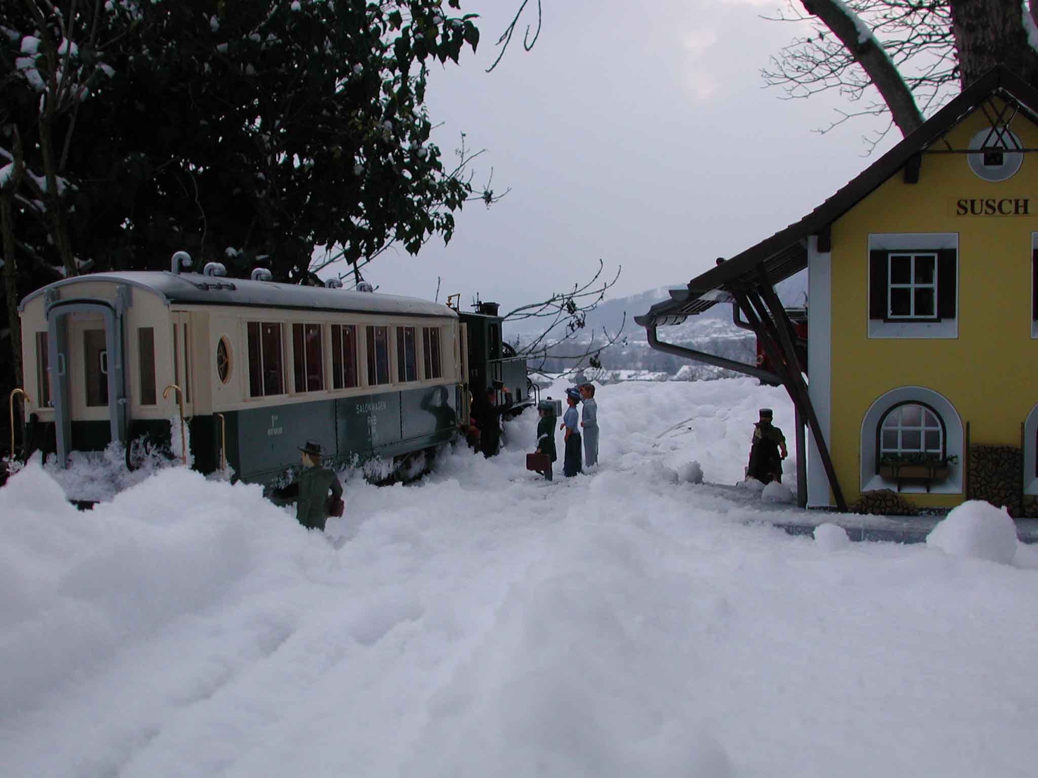 Herr Lehmann ein namhafter Sponsor für die Aufbereitung der "Heidi" hat zum Jahresende vom Club 1889 (der die Heidi aufbereitet hat) eine Fahrt geschenkt bekommen. Start ist in Susch, wo die geladenen Gäste mit zeitgerechter Robe nach und nach eintreffen. Herr Lehmann begrüsst sie vor dem Salonwagen, der extra für diesen Anlass den alten crème/grünen Anstrich bekommen hatte.