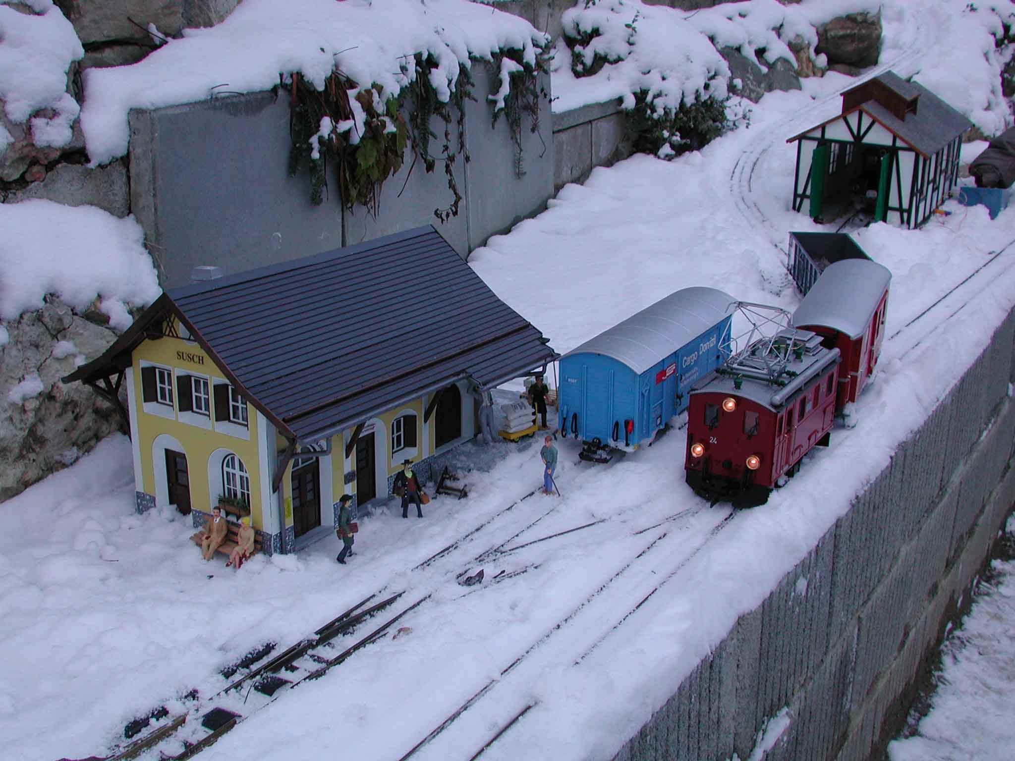 Noch ein paar Worte zu Susch: Susch ist eine Spitzkehre, wo von der Adhäsionsbahn zur Zahnradbahn übergegangen wird. Es gibt nur 2 Gleise, wobei eines sogar noch als Rampengleis dient. Sie sind mit zwei einfachen Weichenübergängen verbunden. Im "Sack" hinten führen die beiden Gleise zusammen und der "Sack" selber bietet Platz um den Triebwagen zu platzieren, damit er eine kleine Wagengruppe umfahren kann. Zudem gibt es noch ein Abstellgleis und einen eingleisigen Lokschuppen.
