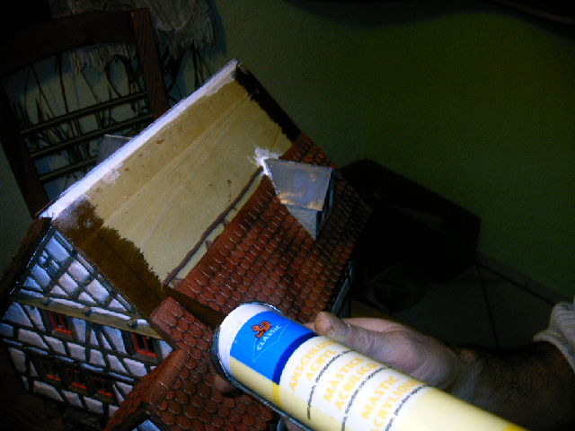 Ritze mit einem alten Sägeblatt zwischen den einzelnen Ziegeln leicht ein. Nun werden die Ziegelbahnen vorzugsweise rot lackiert und mit braunem Acryl aufs Dach geklebt.