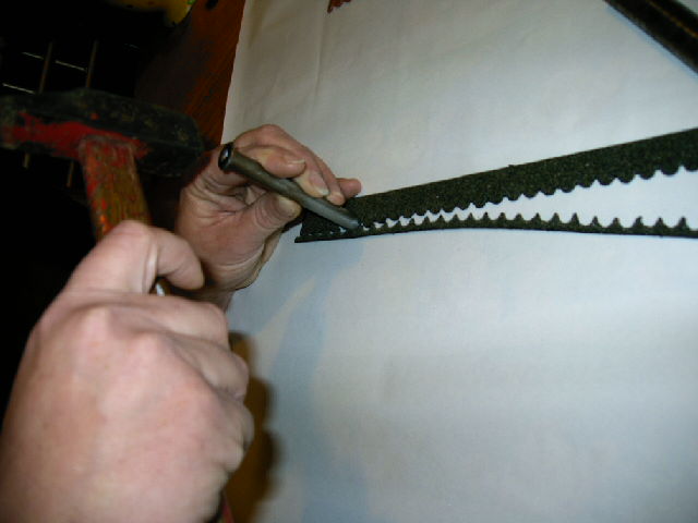 Ich verwende gesandetes Bitumenpapier, das in etwa 3cm breite Streifen und je nach Dachlänge zugeschnitten wird