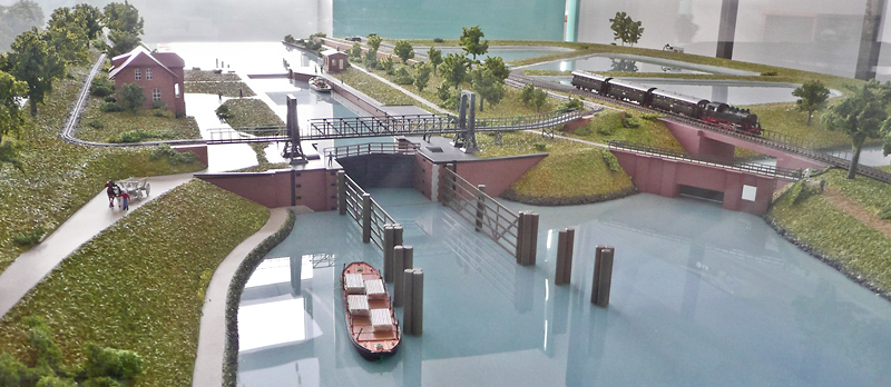 westliche Schleuseneinfahrt mit Feldbahn-Hubbrücke