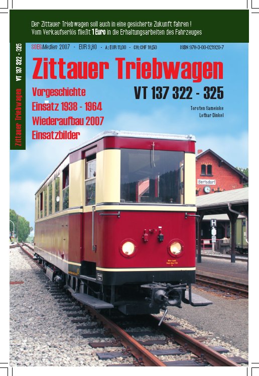 pünktlich zum "Roll-out" erscheint eine neue Broschüre über die Zittauer Triebwagen VT 137 322 - 325. Beleuchtet wird die Vorgeschichte der Fahrzeuge, ebenso der Einsatz zwischen 1938 und 1964 sowie der Wiederaufbau bis 2007. Darin sind eine Reihe bisher unveröffentlichter Fotos abgedruckt, vom Verkaufserlös fließt ein Euro für die weitere Erhaltung des Fahrzeugs - eine gute Sache. Wer Interesse hat kann die Broschüre über unseren Verein bestellen, kostet 9,80 Eur + Porto. Lieferbar ab nächste Woche!