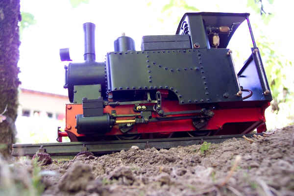 Die Lok hat ein Speiseventil denn der kleine Kessel macht zawar mächtig Dampf aber reicht für ca.14min.Danach muß mit ner Blumenspritze nachgespeist werden.Die Lok fährt insgesamt ca 25min.